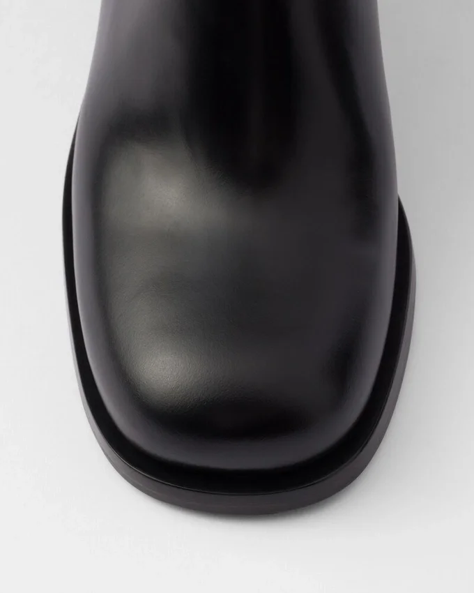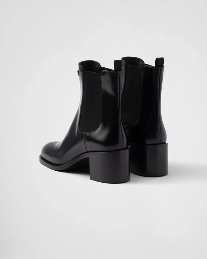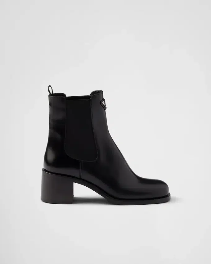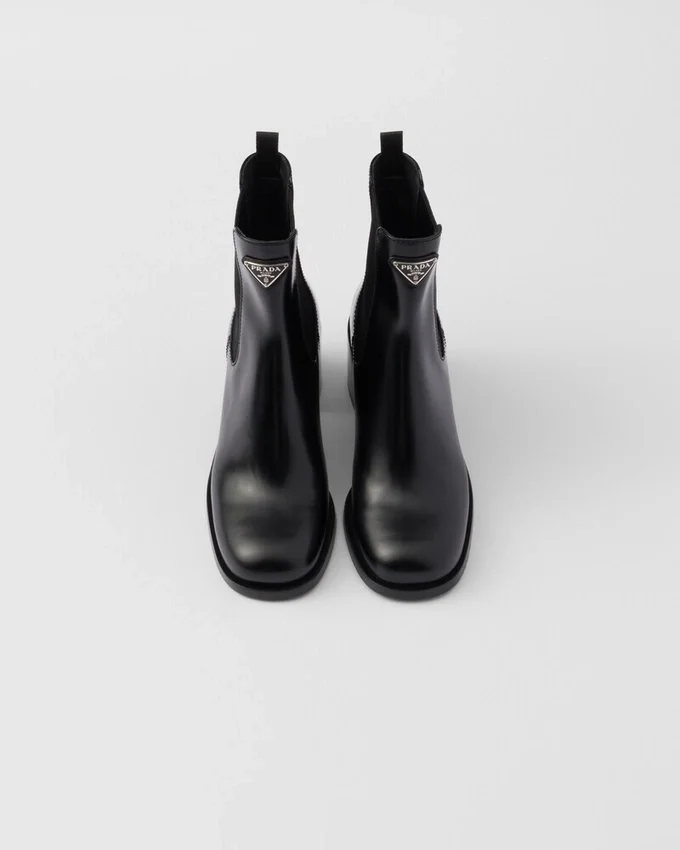 These Brushed Leather Booties Have a Refined and Versatile Design with Clean Lines. The Enameled Metal Triangle Logo Embellishes the Style with Its Sleek, Distinctive Signature.