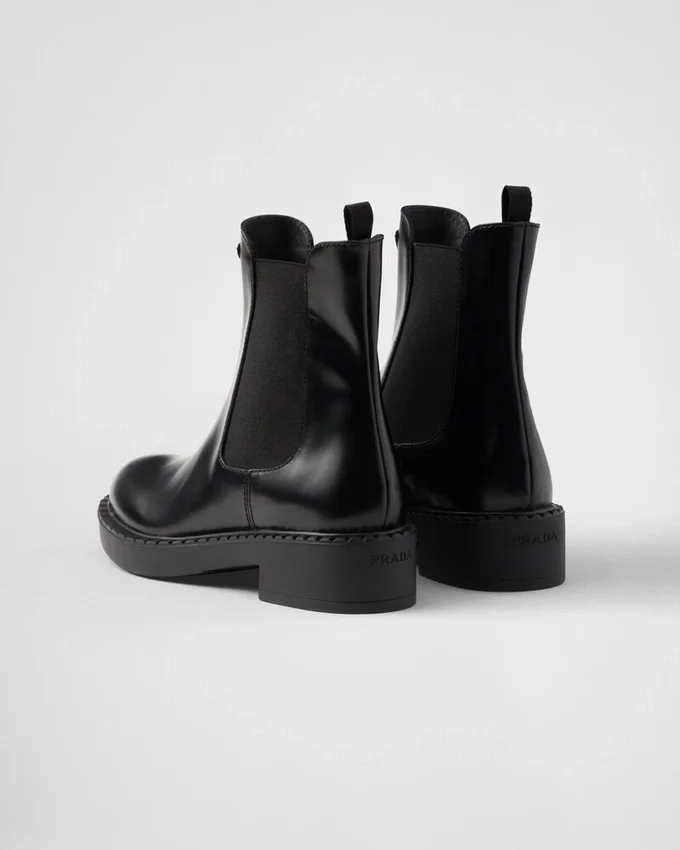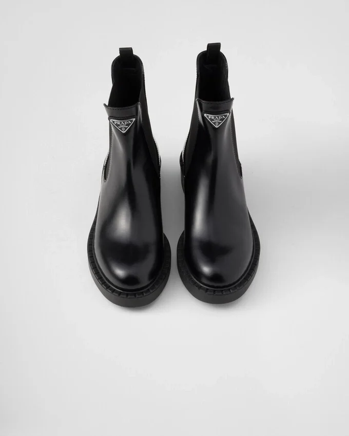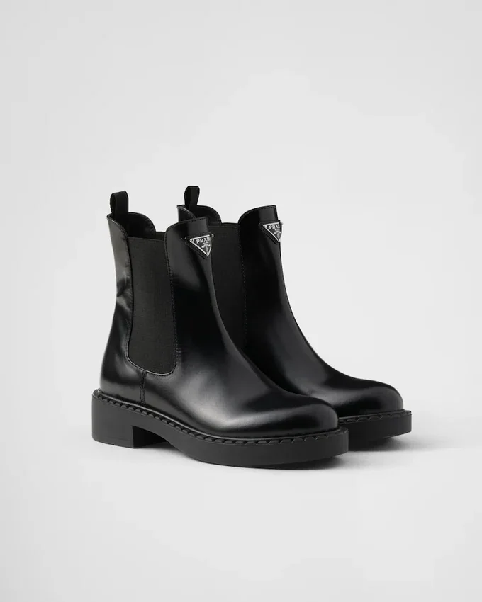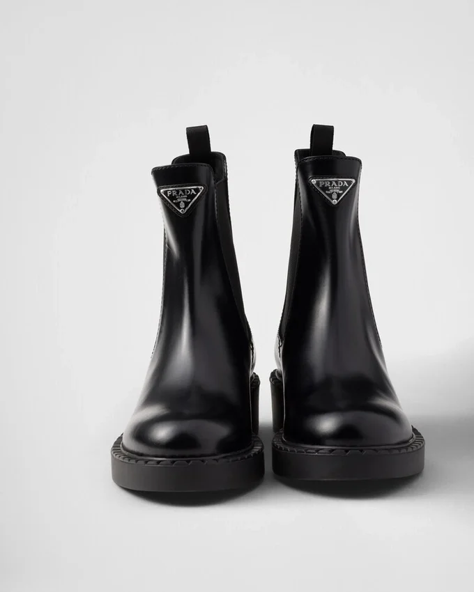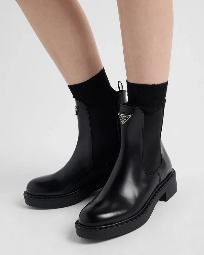 These Brushed Leather Booties Are Defined by the Elasticized Side Gusset and Enameled Metal Triangle Logo That Stands out on the Upper.