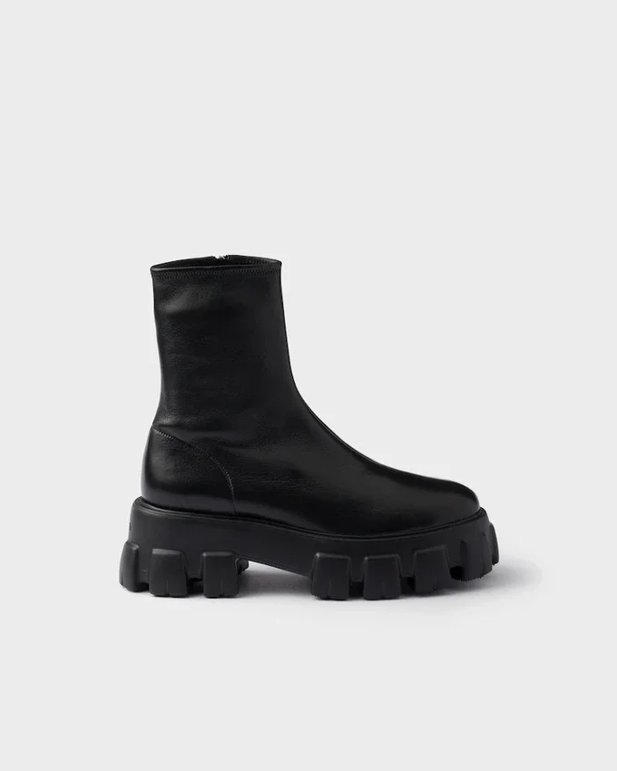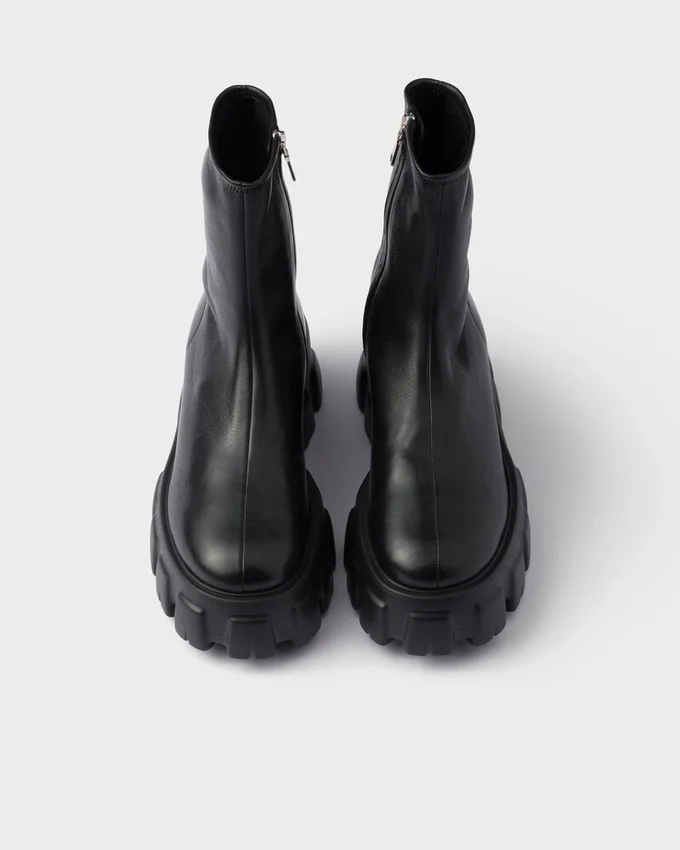A Distinctive Design with Bold Volumes Defines These Booties with Bold Contrasts, an Expression of the Inherent Duality in the Prada Aesthetic. The Iconic Monolith Soles, Geometric and Modernist, Add Unique Character to the Stretch Nappa Leather Style.