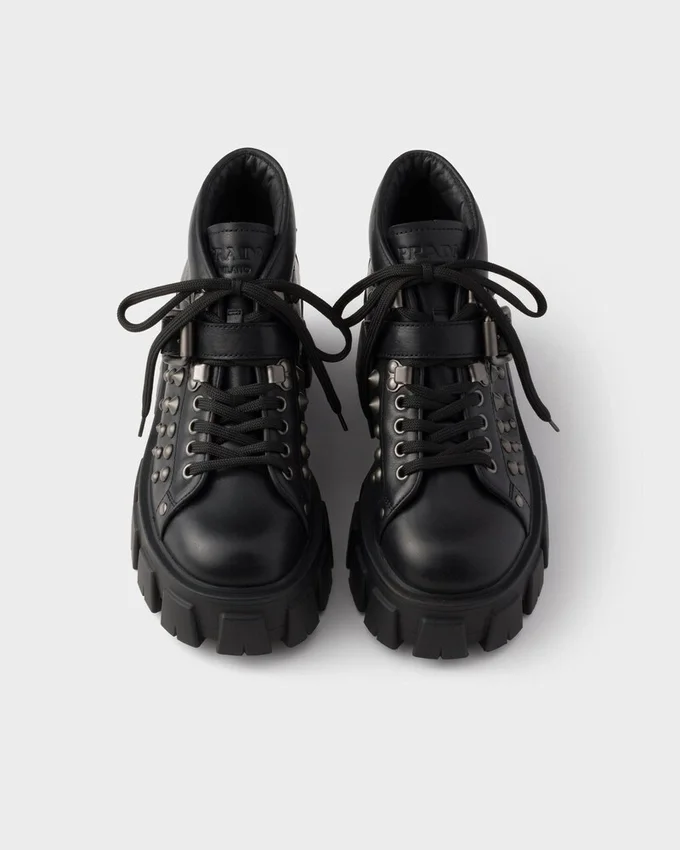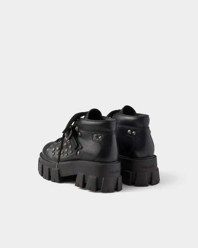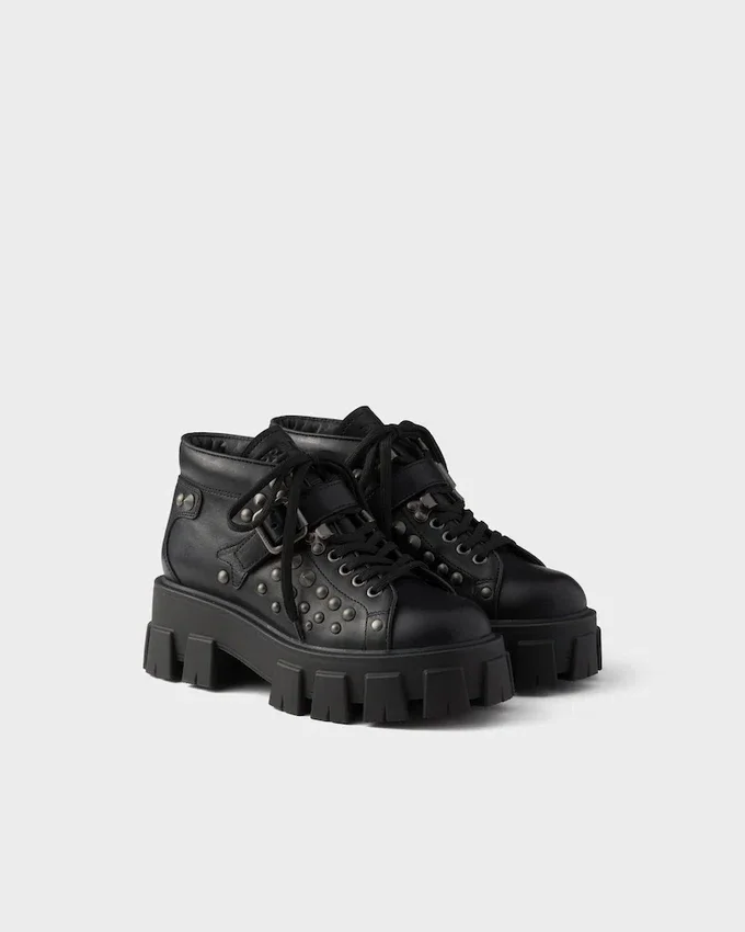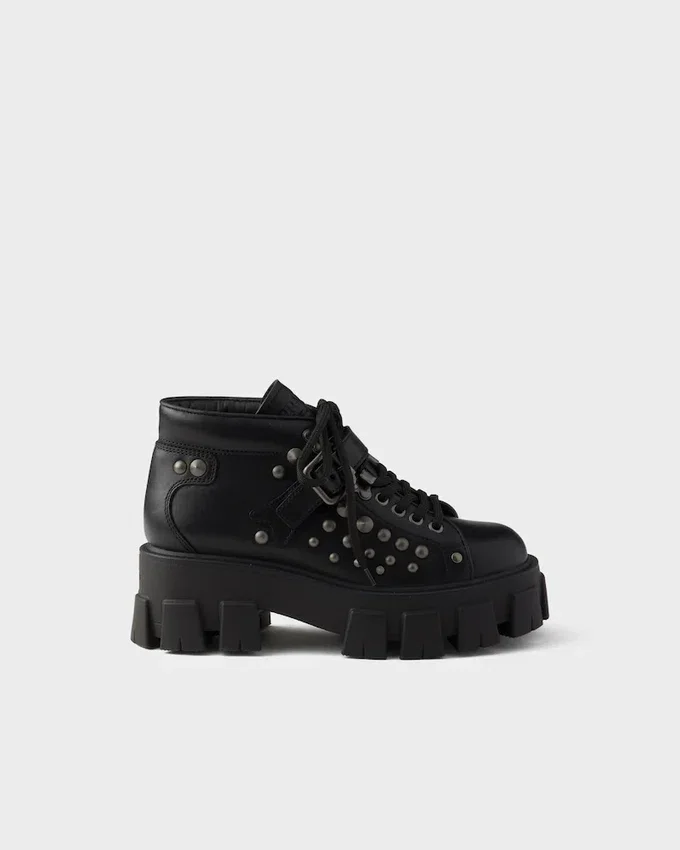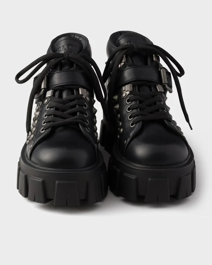 These Bold Leather Booties Are Defined by the Iconic Monolith Soles, Geometric and Architectural. The Lace-Up Design is Completed by Metal Studs and Strap with Metal Buckle That Underline the Strong Character of the Footwear.