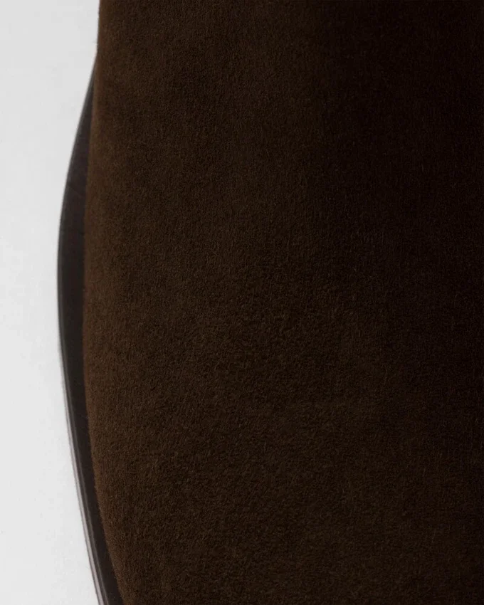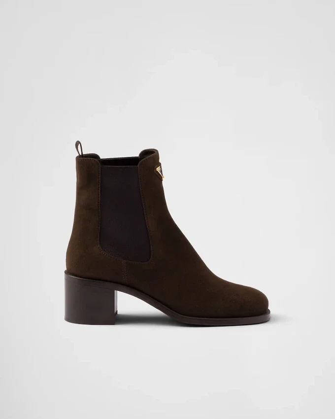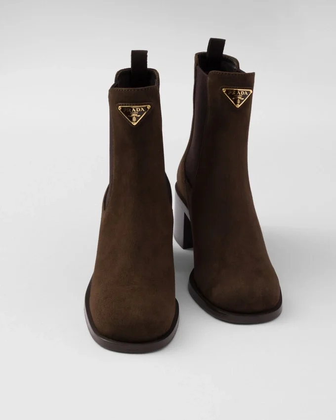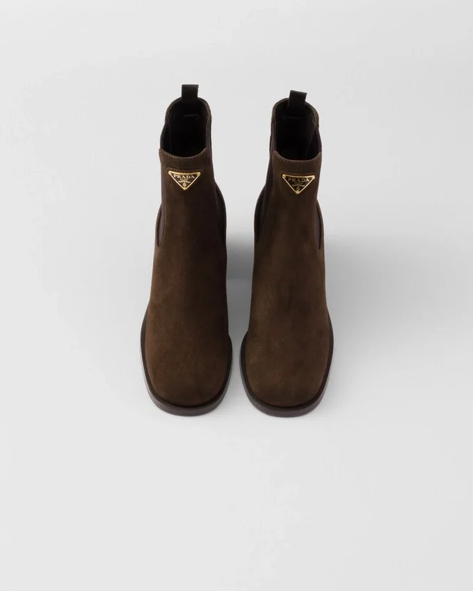 These Suede Booties Have a Refined and Versatile Design with Clean Lines. The Enameled Metal Triangle Logo Embellishes the Style with Its Sleek, Distinctive Signature.