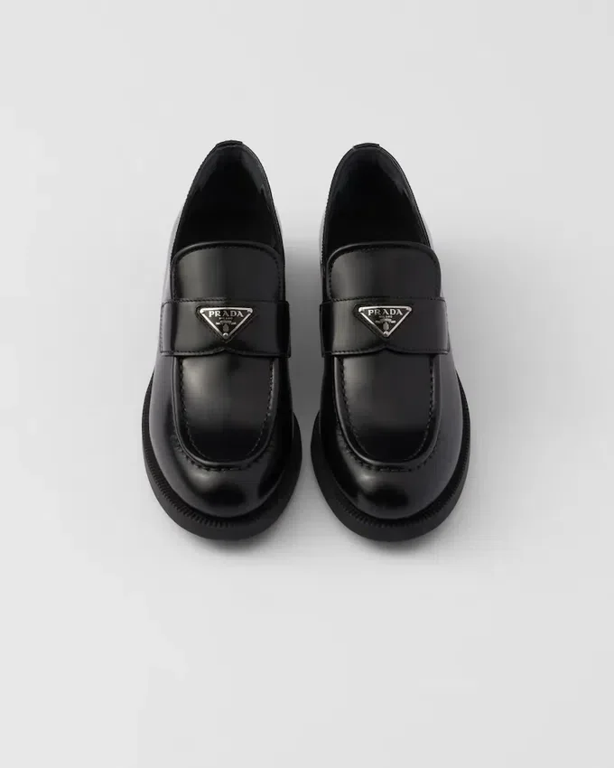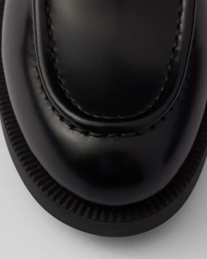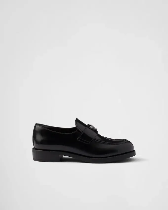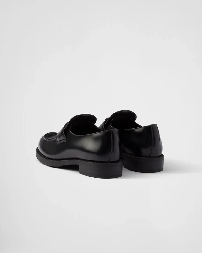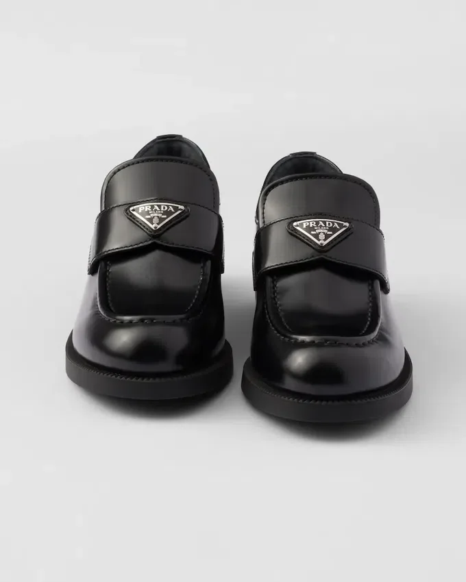 A Design with Tapered Lines Reinterprets the Iconic Men’s Loafer. Elegant Tonal Stitching Outlines the Contemporary Footwear Enriched by the Refined Finish of Brushed Leather That, Together with the Rubber Soles, Gives the Style a Touch of Versatile Elegance. The Enameled Metal Triangle Logo Completes the Look with Its Simple Yet Distinctive Signature.