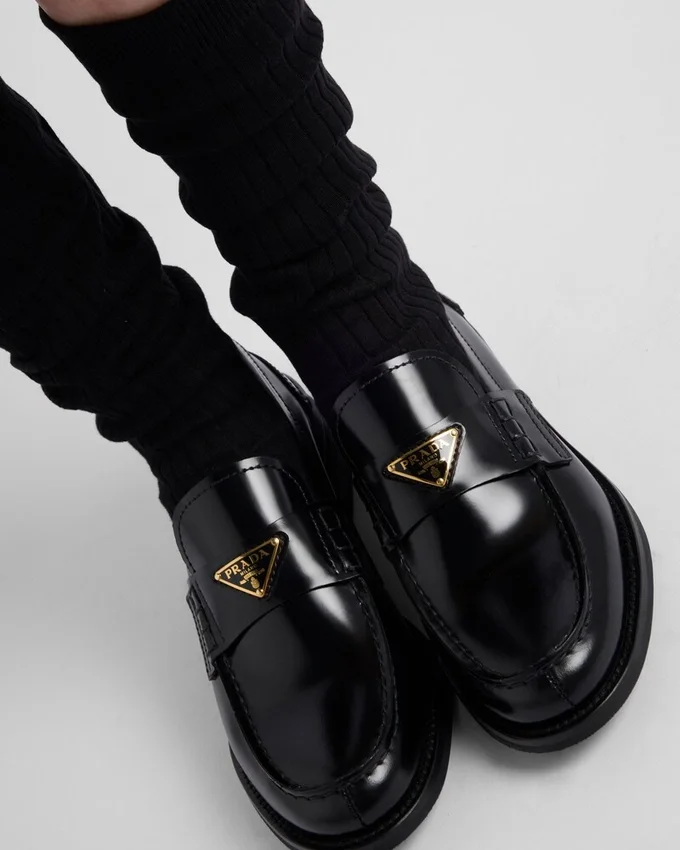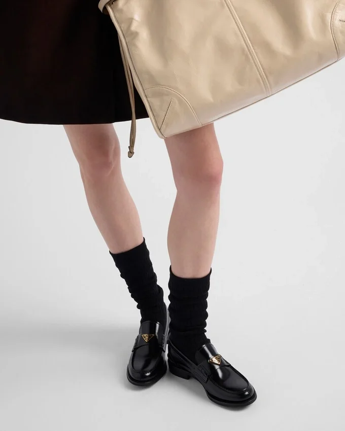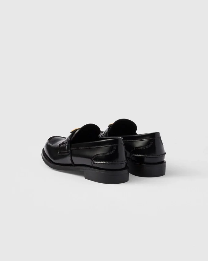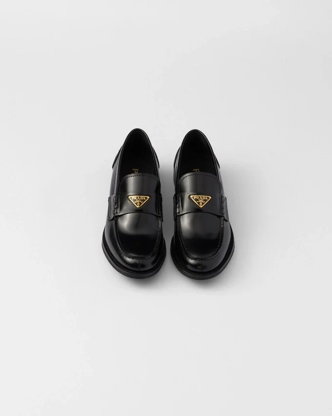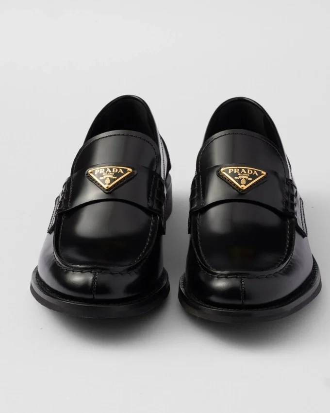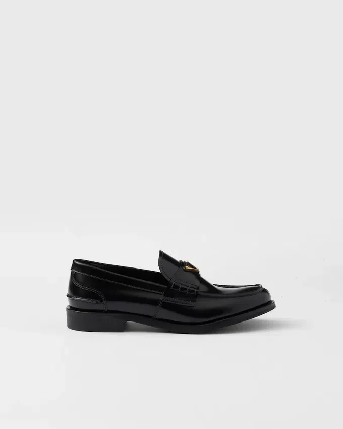 The Timeless Silhouette of These Loafers Stands out Due to the Finely Crafted Details and Refined Finish of Brushed Leather That Enriches the Design Along with the Distinctive Triangle Logo.