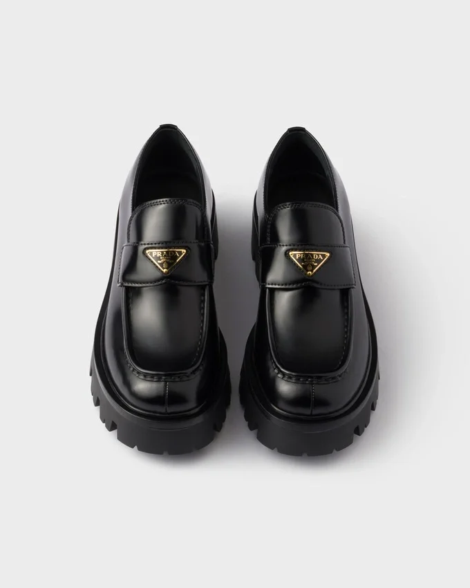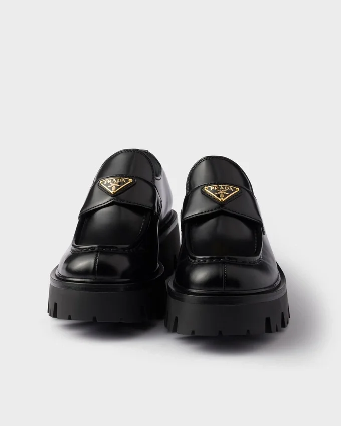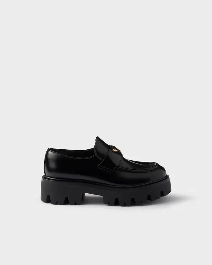 These Brushed Leather Loafers Combine Classic Elements and Contemporary Volumes. The Chunky Soles Made of Lightweight Yet Durable Rubber Complete the Footwear with Artisan Details Decorated with the Triangle Logo.