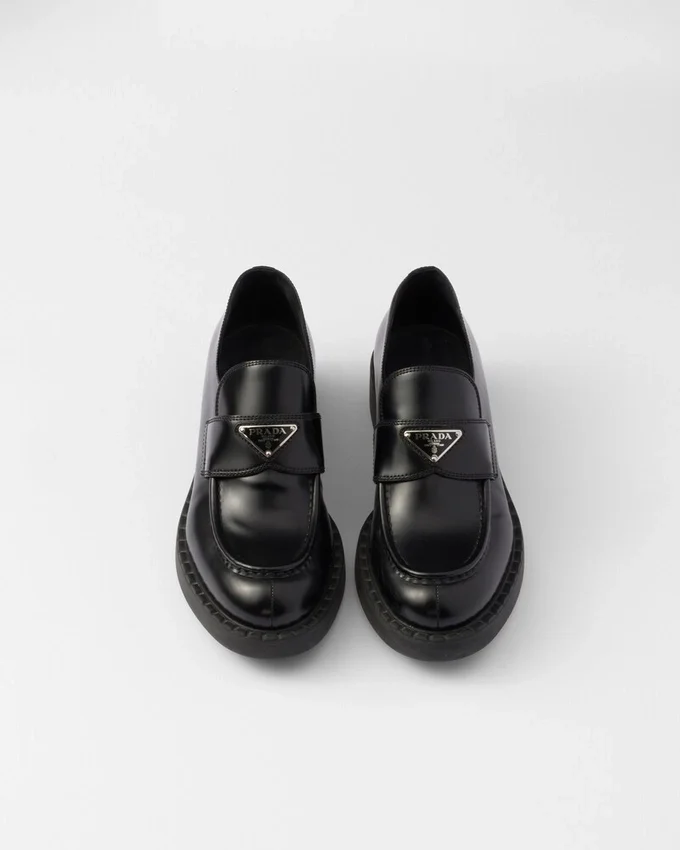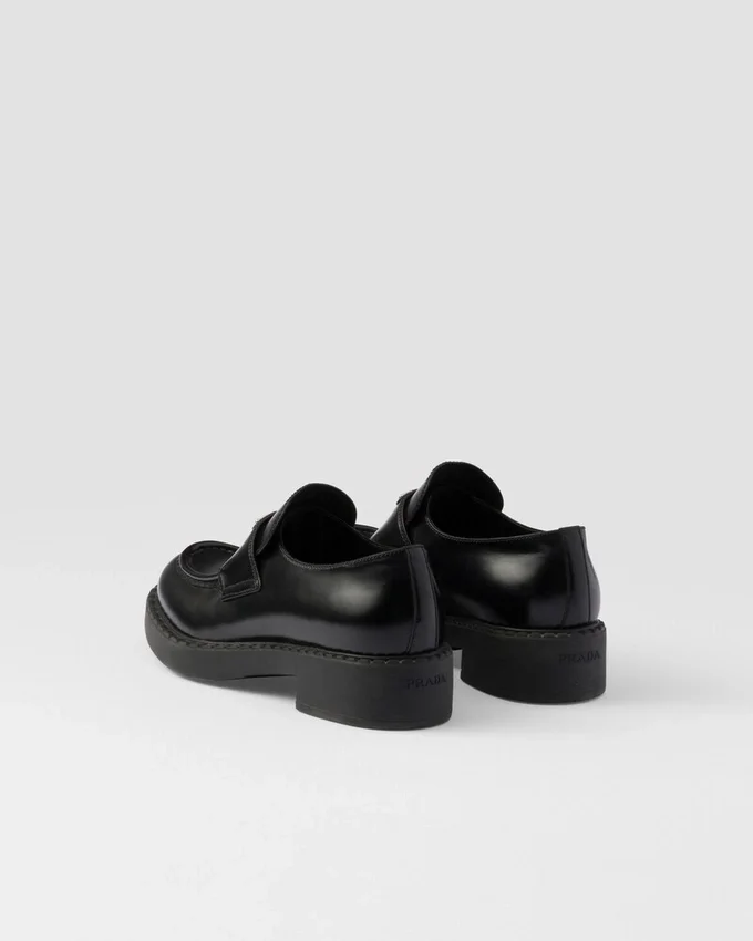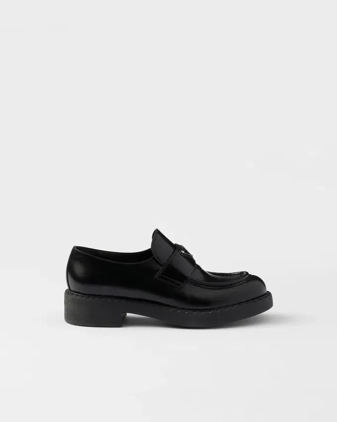 Emphasized by the Iconic Enameled Triangle Logo, These Retro-Inspired Loafers Are Made of Brushed Leather, Traditionally Used in Classic Fine Footwear and Reinterpreted in Prada Collections on Unexpected Designs for a Hybrid Result That Reflects the Duality of the Brand. The Notched Effect of the Welt Around the Shoe Gives It a Handcrafted Touch.