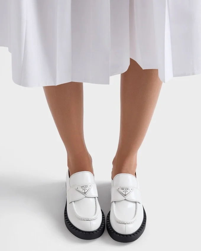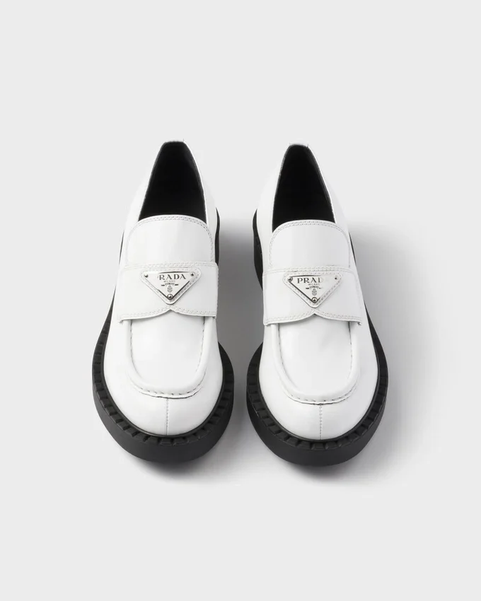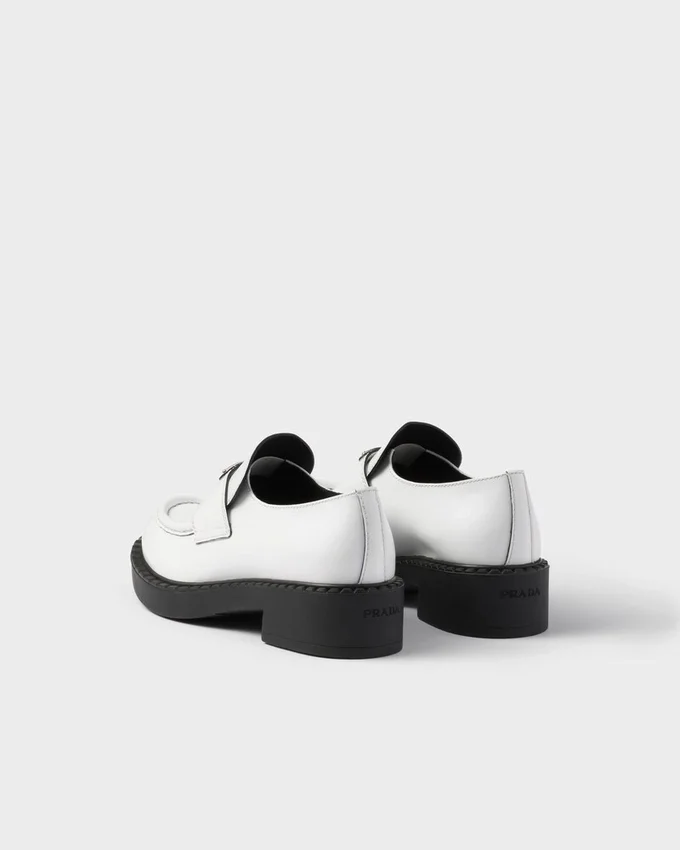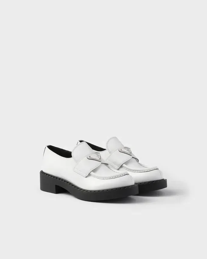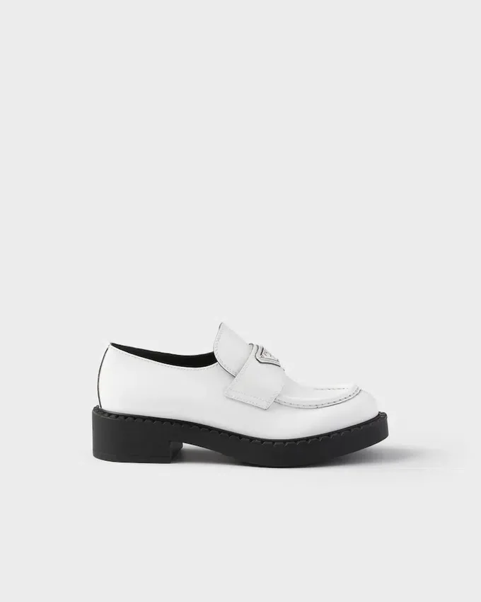 Emphasized by the Iconic Enameled Triangle Logo, These Retro-Inspired Loafers Are Made of Brushed Leather, Traditionally Used in Classic Fine Footwear and Reinterpreted in Prada Collections on Unexpected Designs for a Hybrid Result That Reflects the Duality of the Brand. The Notched Effect of the Welt Around the Shoe Gives It a Handcrafted Touch.