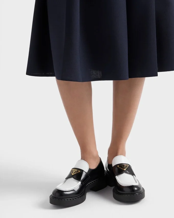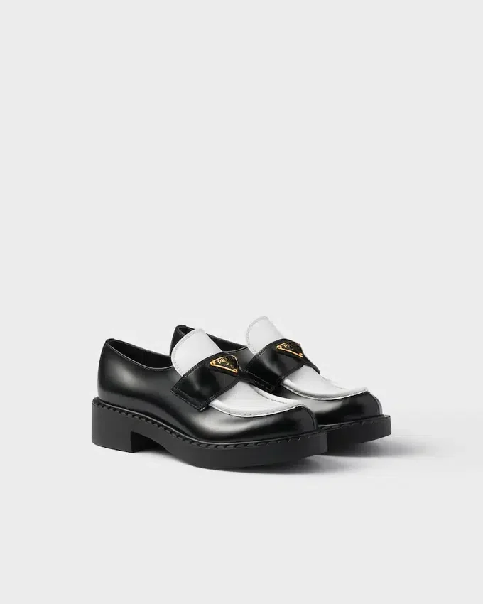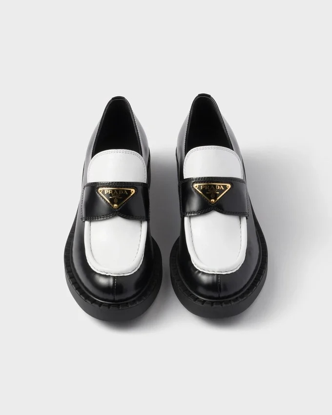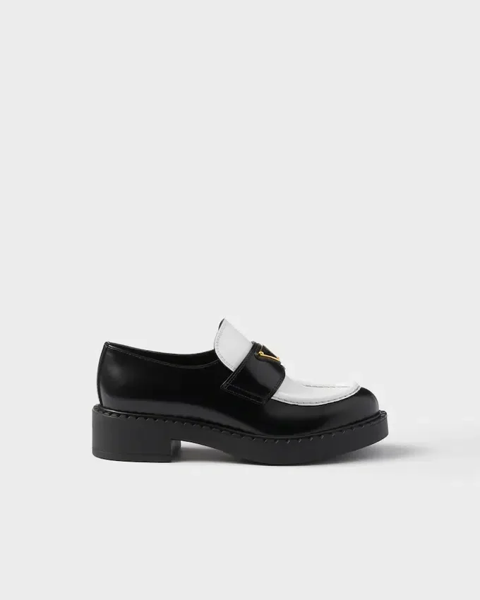 Chocolate Loafers, a Distinctive Design of the Prada Universe, Embody a Versatile, Refined Style. The Hybrid Silhouette is Characterized by the Juxtaposition of Classic Materials and Details with the Modernist Volumes of the Rubber Soles. Bold Color Contrasts Animate This Brushed Leather Version Completed by the Emblematic Enameled Metal Triangle Logo.