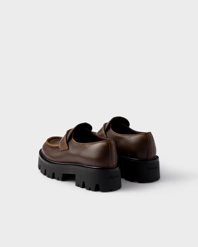These Vintage-Effect Leather Loafers Combine Classic Elements and Contemporary Volumes. The Chunky Soles Made of Lightweight Yet Durable Rubber Complete the Footwear with Artisan Details Decorated with the Triangle Logo.