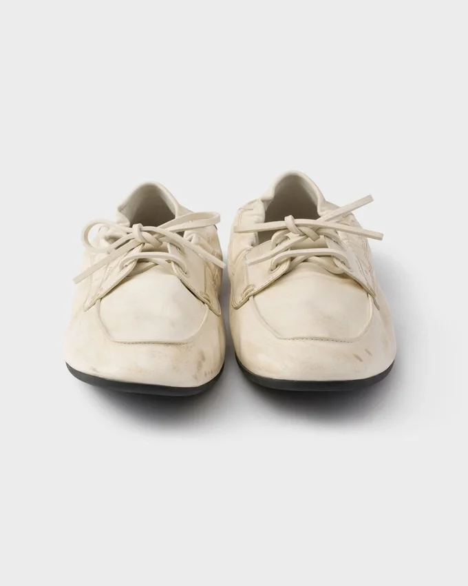 Boat Shoes, a Classic with Formal Style, Are Reinterpreted with an Innovative and Completely Deconstructed Design. The Laced Shoe Expresses an Evolution in the Construction of Footwear That Favors Light, Soft and Flexible Silhouettes. Made of Antiqued Leather with a Vintage Effect, These Boat Shoes with Sleek Lines Are Decorated with the Refined Lettering Logo.