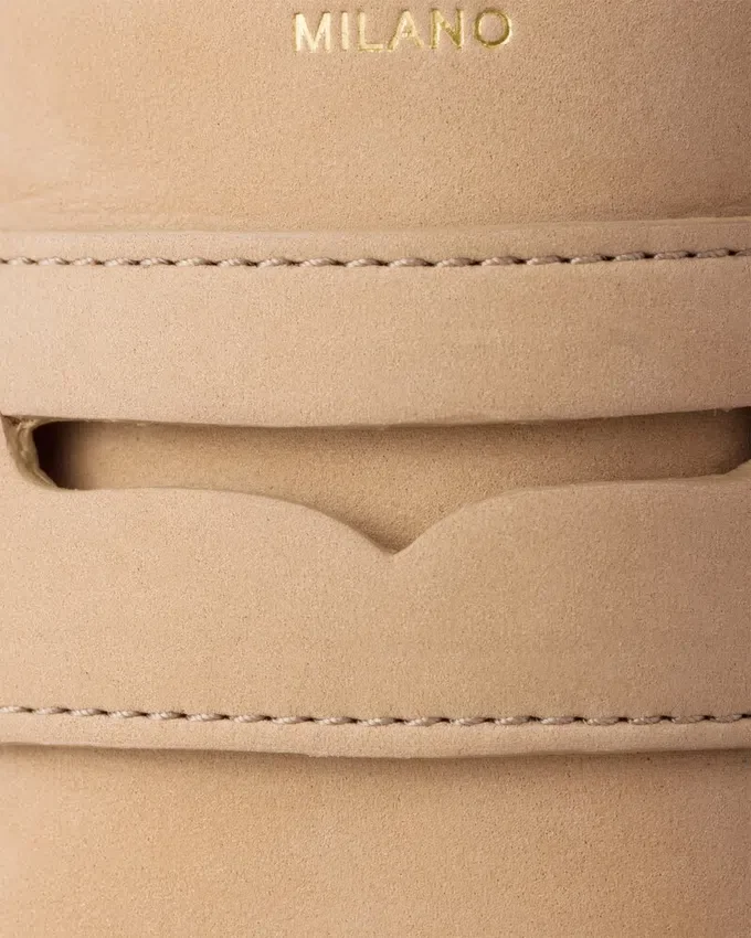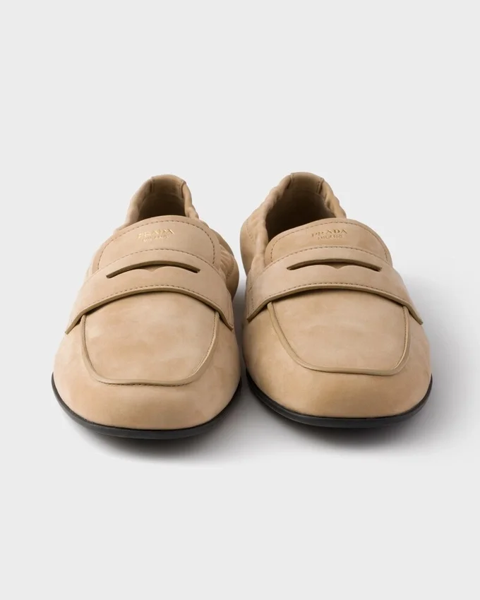 The Prada Shoe Collection Explores New Silhouettes to Reinterpret Classic Styles with a Contemporary Attitude. These Loafers Feature a Lightweight, Deconstructed Silhouette, Emphasized by the Soft Nubuck Leather Enriched by the Logo.
