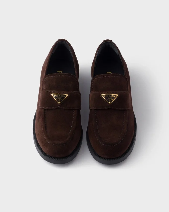 The Classic Loafer Silhouette is Reinterpreted with Clean, Elegant Lines That Give the Design a Contemporary Attitude. The Suede Shoes with Rubber Soles Feature Tonal Stitching and Are Decorated with the Enameled Metal Triangle Logo.