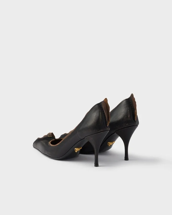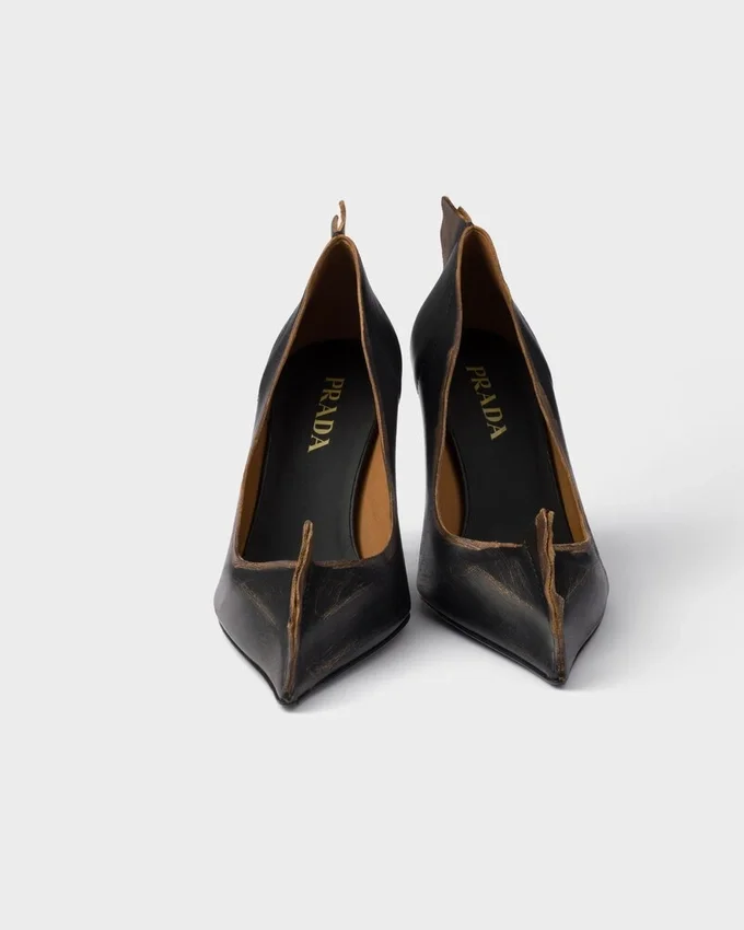 Strong Lines and Bold Details Transform the Pump, an Emblem of Femininity, in an Original and Unconventional Design. The Pointy-Toe Silhouette in Antiqued Leather Has Visible Stitching and Raw-Cut Edges Intentionally Left Unfinished. The Stiletto Heel Completes the Tapered Shoe, an Expression of Multifaceted Style.
