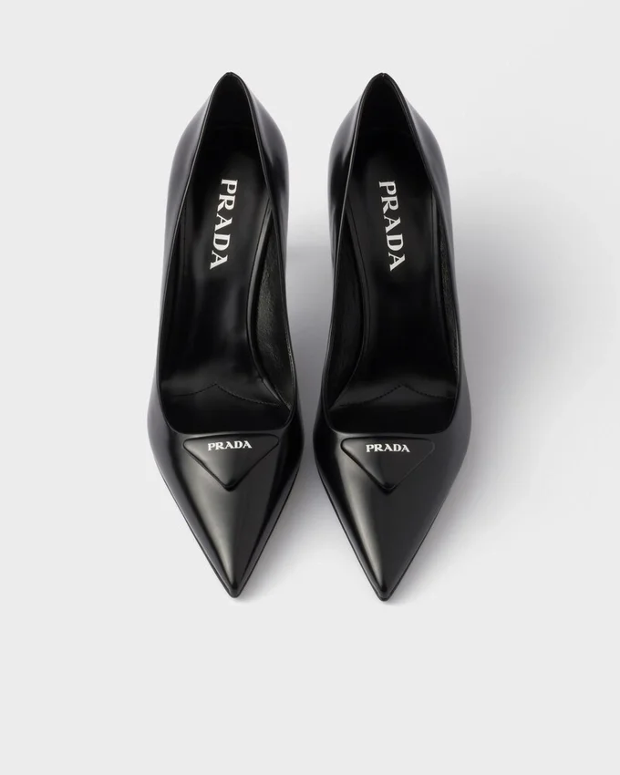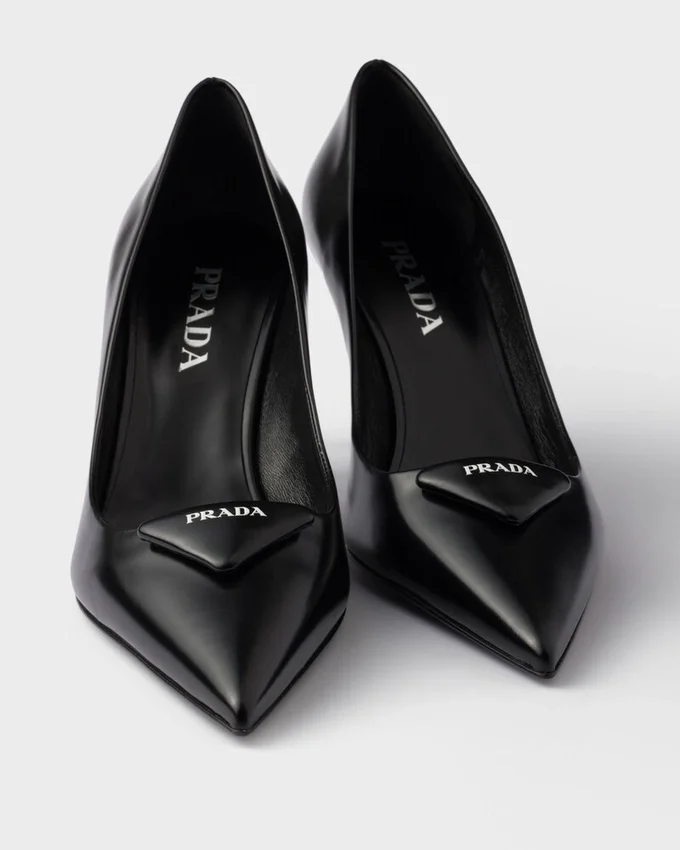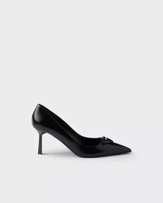 These Pumps Expressing Sophisticated, Feminine Elegance Are Made of Brushed Leather, an Emblematic Material of Prada Since the 90S, Traditionally Used for Luxury Footwear. The Triangle Logo Returns as a Slightly Padded Leather Detail and Inspires the Geometric Line of the Heel, Which Gives the Silhouette a Modernist Note.