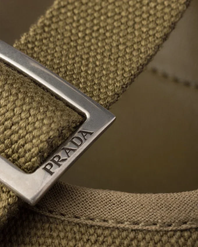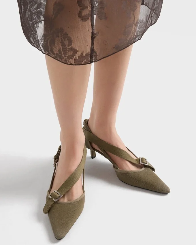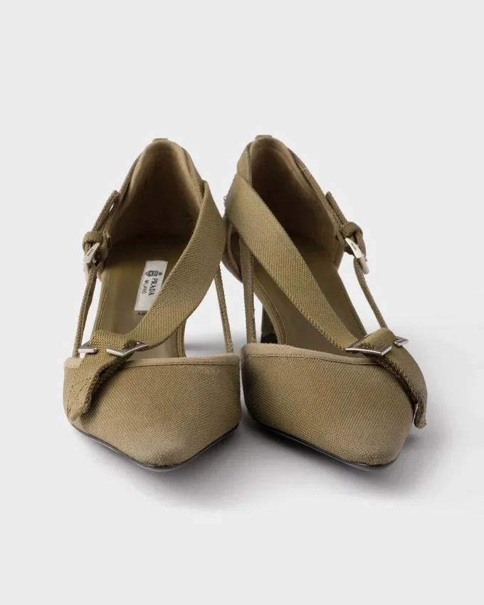 Blending Utility Style and Embellishment, Rigor and Glamor, These Pumps Are the Synthesis of an Exploration of Contrasts. An Unexpected Harmony is Created Between the Feminine Silhouette and the Pragmatic and Informal Texture of Canvas. The Distinctive Geometric Kitten Heel Completes the Footwear, Enriched with Metal Buckles That Underline the Unconventional Nature of the Design.