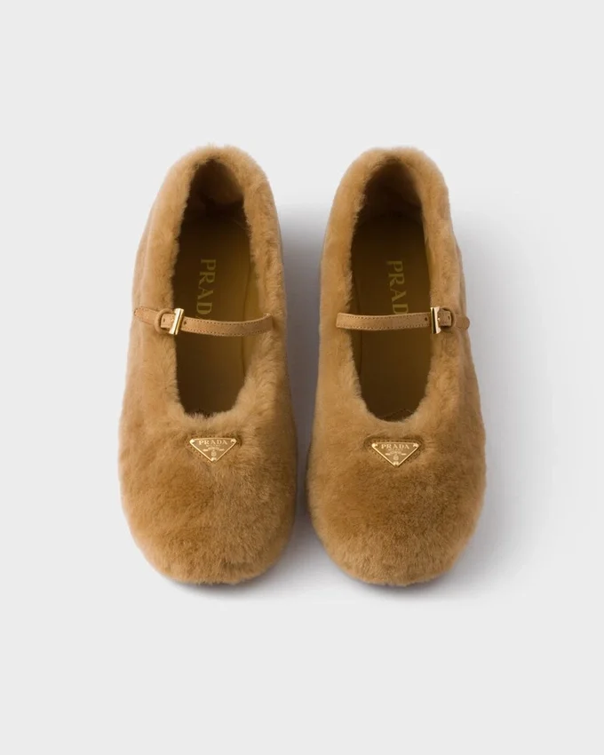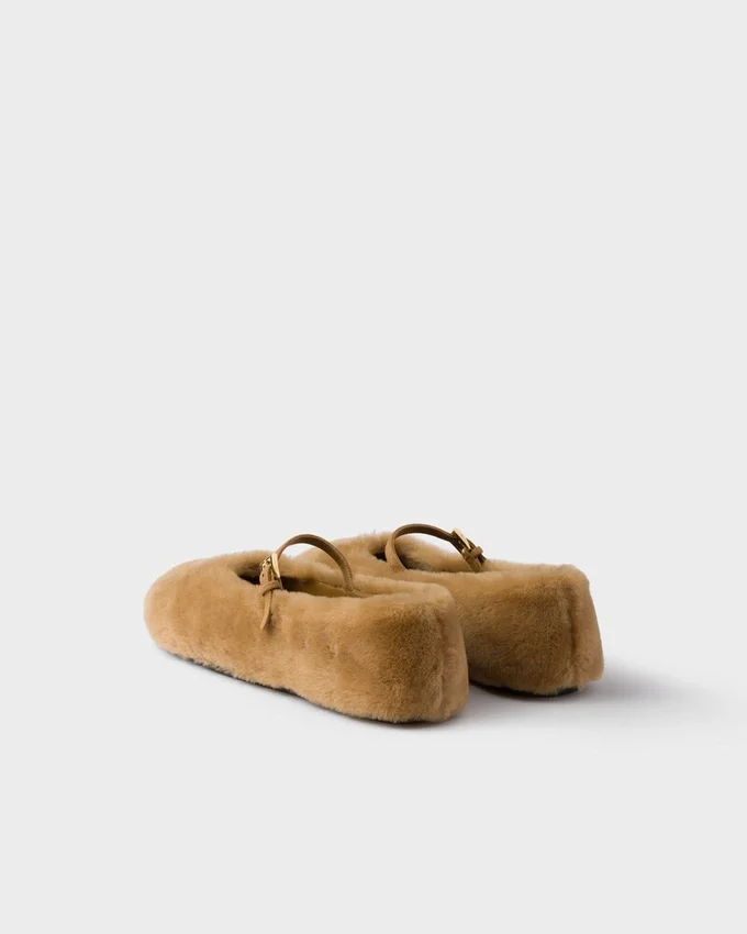 The Design of These Ballerinas Plays with Soft Volumes and Winter Textures That Redefine These Feminine Shoes with Timeless Style. The Shearling Shoe is Decorated with the Enameled Metal Triangle Logo.