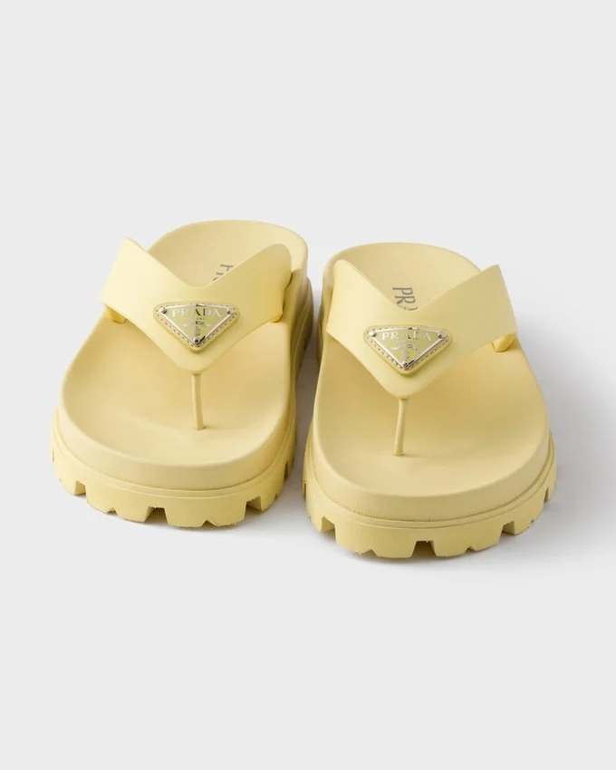 These Rubber Thong Sandals Have a Contemporary Silhouette with Sleek Details. The Style, Enriched by the Iconic Enameled Metal Triangle Logo, is Characterized by a Rubber Sole with Lug Tread That Adds a Sporty Touch.