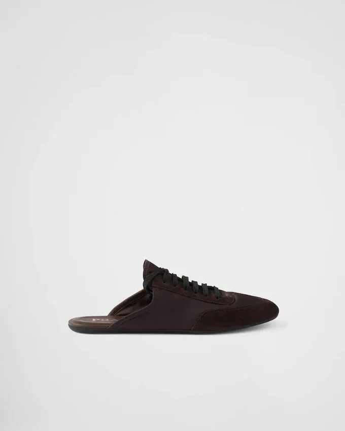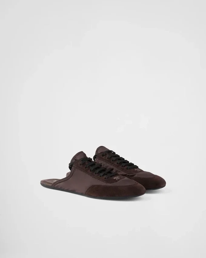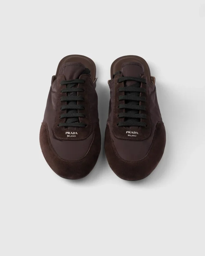 These Mules with an Innovative, Hybrid Silhouette Embody Prada’s Sporty, Artisanal Soul. Made of Re-Nylon and Suede Leather, They Have Flat Soles and a Vintage Finish That Adds Character to the Soft, Light Design. This Product Does Not Contribute to the Sea Beyond Educational Program.