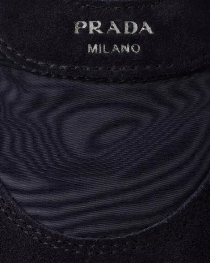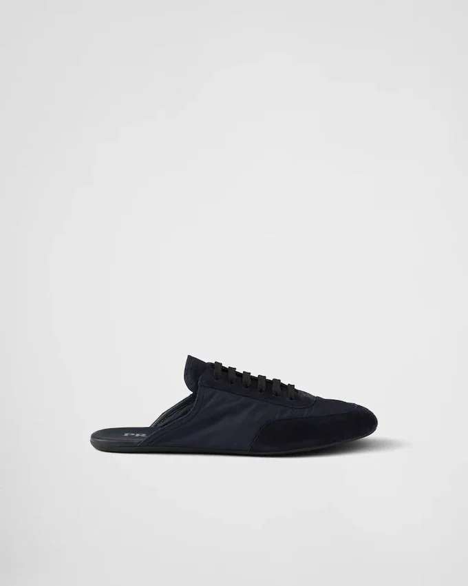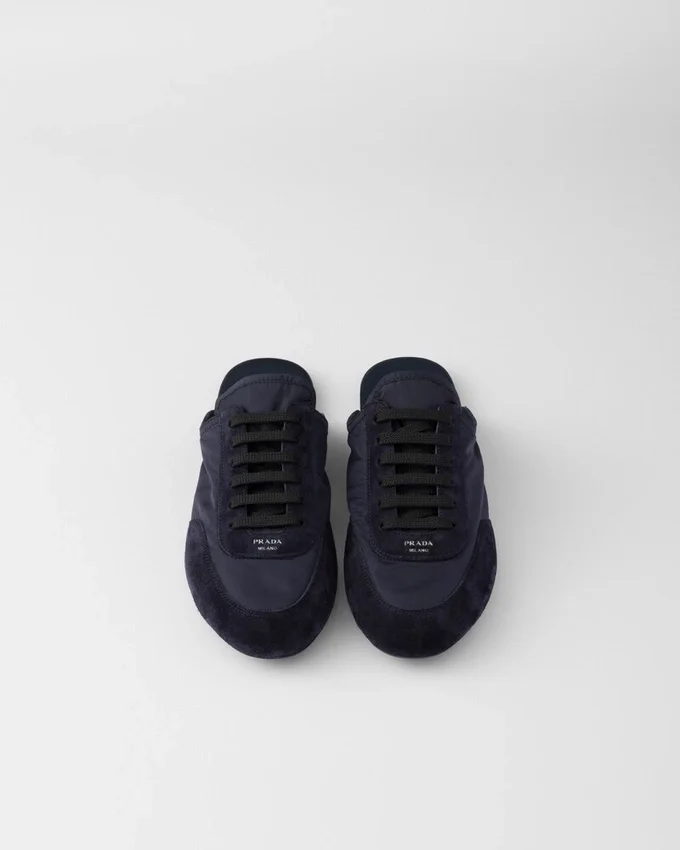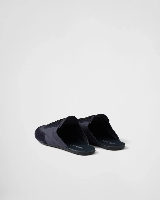 These Mules with an Innovative, Hybrid Silhouette Embody Prada’s Sporty, Artisanal Soul. Made of Re-Nylon and Suede Leather, They Have Flat Soles and a Vintage Finish That Adds Character to the Soft, Light Design. This Product Does Not Contribute to the Sea Beyond Educational Program.
