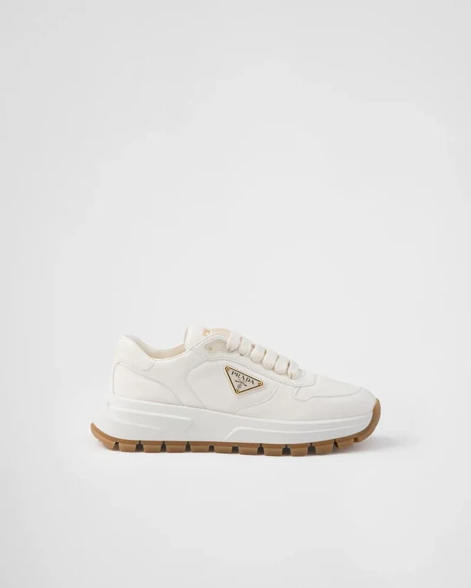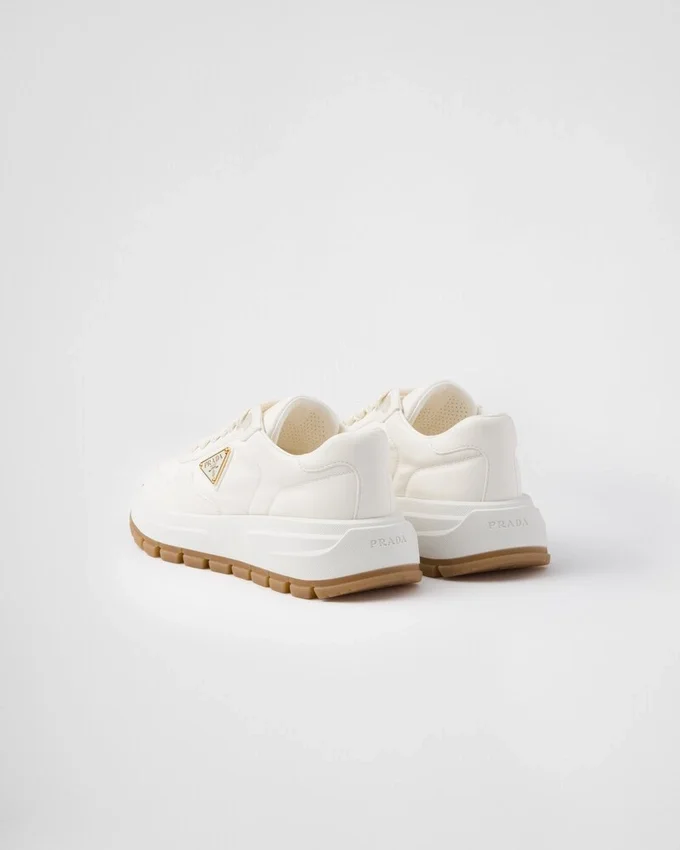 These Leather Sneakers with a Sporty Silhouette and Pragmatic, Modern Design Are Characterized by a Comfortable Rubber Sole. The Shoe Decorated with Different Interpretations of the Prada Logo is Completed by the Distinctive Touch of the Iconic Enameled Metal Triangle Logo.